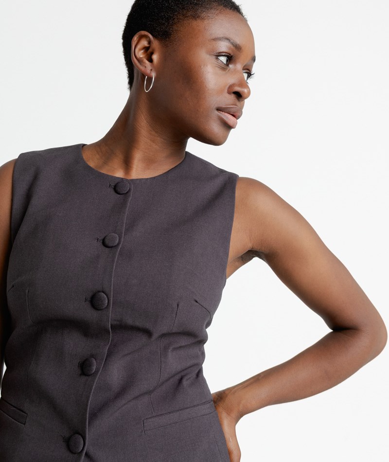 • Mit durchgehender Knopfleiste und stoffüberzogenen Knöpfen