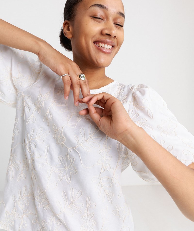 • Weißes T-Shirt mit floralem Stick-Muster in Cremefarben
